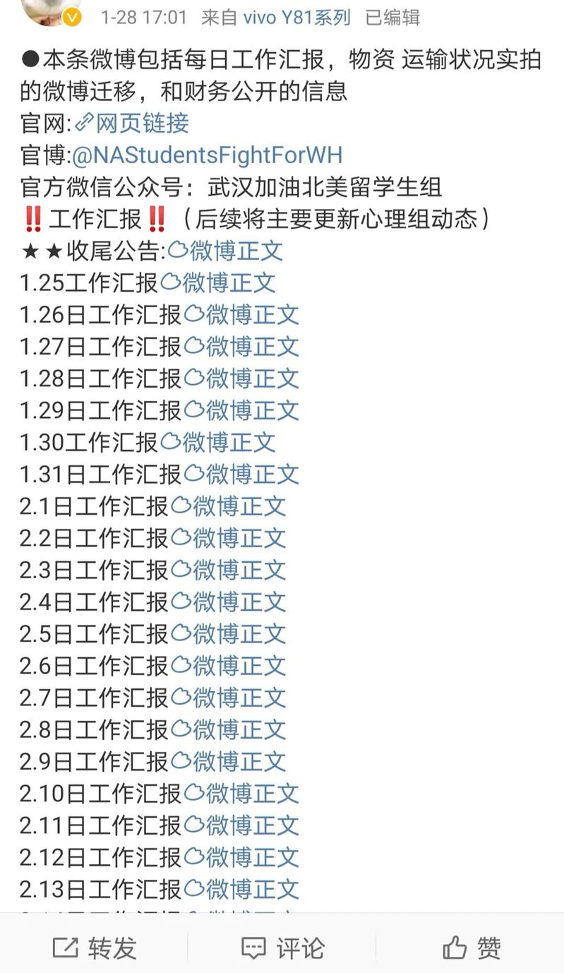 2020年8月7日,我于微博采访到一位北美留学生张同学(化名),她曾在疫情期间与数位北美留学生组成“武汉加油*北美留学生组”支援武汉。张同学的的微博上详细记录了他们北美留学生组援助武汉的情况,他们捐助口罩、呼吸机等医用品的数量高达几万,每一笔资金每一件物品的明细都被准确的罗列在张同学的微博里,这样巨大的工作量体现了这群优秀青年的责任和细心。而他们的行动也受到社会各届人士的关注,并纷纷表示支持他们的行动。