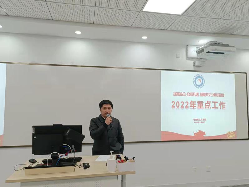 会上,学院党政工班子成员分别就分管工作进行安排部署。学院党委副书记杨倩介绍了学院学生的整体情况,并就学生党建、就业、共青团等学生管理方面的工作进行了具体部署。卢杨从落实全面从严治党主体责任,做好监督工作、夯实基础,扎实推进教工党支部建设,强化青年教师培养,提升青年教师能力等五个方面进行了工作部署。学院副院长徐国民主要部署了2022年本科教学工作安排,对课程建设、课堂教学、教学改革、教师培训等方面的工作作出了具体安排。学院副院长邱卫东指出,2022年上半年科研工作要聚焦马克思主义理论学科建设,做好科研的“三服务一支撑”工作,同时围绕校庆70周年和党的二十大举办系列主题论坛,做好科研团队建设。学院副院长汪斌锋就全校研究生思政课教学、校友工作、合作交流等工作进行了部署,强调近期的重点工作是做好马院研究生招生、培养和学位点的建设。学院工会主席刘芳在工作计划中指出,工会目前计划通过成立瑜伽健身小组、购买乒乓球桌等设备、举办集体生日会等活动,进一步丰富教职工的业余生活,为教职工营造出良好的工作氛围。