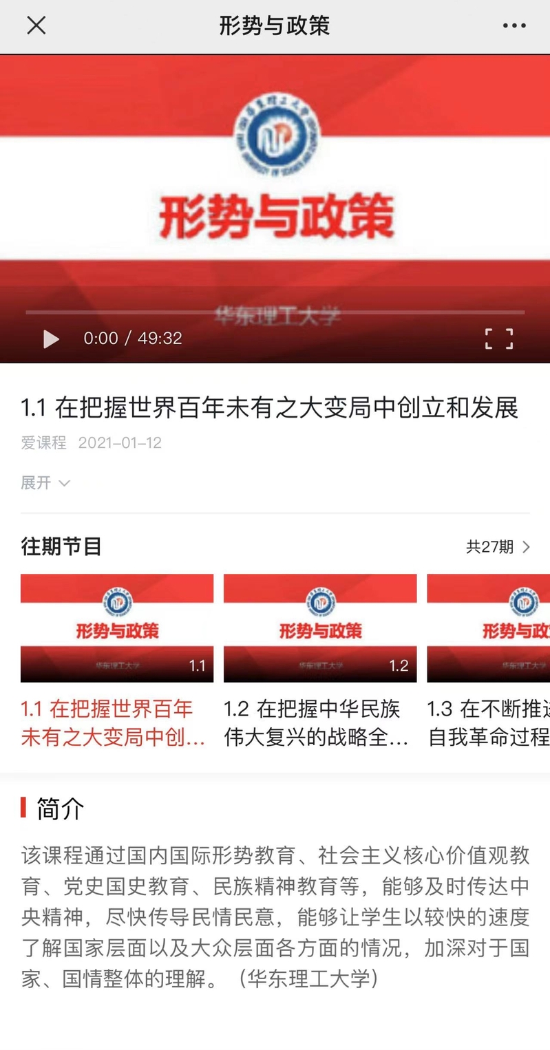作为高校思想政治理论课的重要组成部分,“形势与政策”课程依据教育部社科司每学期下发的“形势与政策”教育教学要点,以国际国内的新变化和广大师生关注的难点、热点问题为专题的内容依据,组织专家进行专题化教学,旨在帮助广大青年学子树立马克思主义的立场、观点和方法,实现四个“正确认识”,成为能够担当民族复兴大任的时代新人。课程2017年开始建设在线课程资源以来,先后入选校精品在线开放课程、国家级精品在线开放课程。截止到目前,本课程在爱课程网(中国大学MOOC)已经成功运行10期,成为在线教学的双创类热门课程之一,累计共有来自全国100多所高校的60000多学生受益其中。