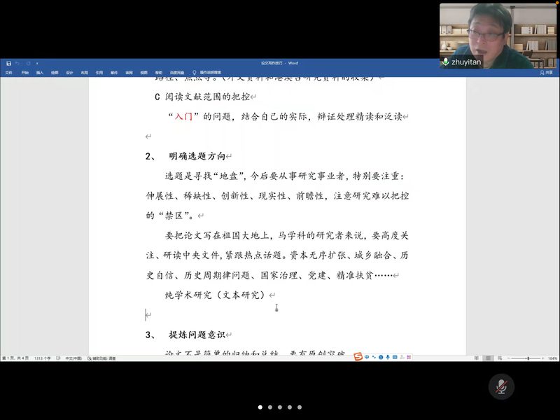 会上,朱忆天从“圈定阅读文献”“明确选题方向”“提炼问题意识”“规范文献综述”“做好谋篇布局”“注重学术规范”这六个方面对如何写好学位论文进行了深入浅出的阐述,并对同学们在写作过程中遇到的问题逐一进行了耐心细致的解答。讲座中,朱教授结合实际案例娓娓道来,以点带面,鼓励大家将论文写在祖国大地上,为同学们的论文写作提供了具有针对性的指导和富有启发性的思考。