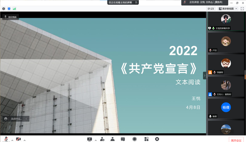 4月8日下午,开云kaiyun官方网站第三期“云端品读 书香战疫”经典著作读书会以腾讯会议的形式顺利举行,学院2021级博士研究生王悦带领大家学习了《共产党宣言》(以下简称《宣言》),学院青年教师张九红受邀为学生答疑解惑。读书会由学院研究生会文艺部雷凯利主持,学院党委副书记杨倩、团委书记胡博成和硕博学生50余人参加。