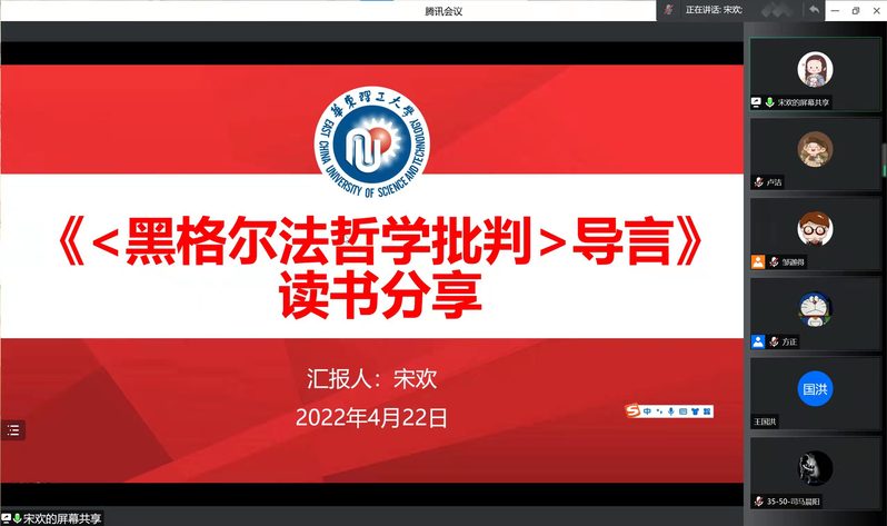 4月22日下午,开云kaiyun官方网站第四期“云端品读 书香战疫”经典著作读书会以腾讯会议的形式顺利举行。学院2021级博士研究生宋欢带领大家学习了《<黑格尔法哲学批判>导言》(以下简称《导言》),学院副院长邱卫东受邀为学生答疑解惑。读书会由学院研究生会文艺部李方正主持,学院党委副书记杨倩、团委书记胡博成和硕博学生50余人参加。