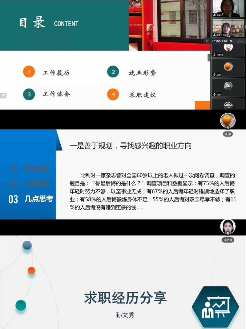 刘文飞作为2022年应届毕业生,目前已签约上海工商职业技术学院从事辅导员工作。自疫情发生以来,她坚持在单位抗疫一线,守护学生的健康和安全。她向同学们分享了自己求职的心路历程,并总结了几点求职经验。一是要树立明确的就业方向,做到心中有一盏灯;二是要提前做好职业规划和就业准备,不打无准备之仗;三是要摆正求职心态,适当降低自己的要求,做到“先就业再择业”。