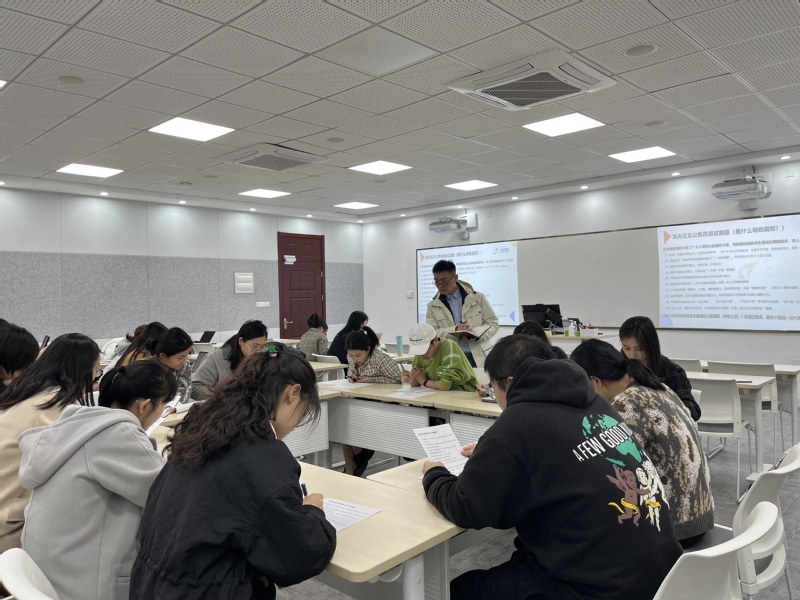 第二场培训主题为“面试突破模拟——角色扮演式面试”。曹元东引用具体案例为同学们介绍了无领导面试的模拟和点评规则,强调了面试中的注意事项并组织同学们进行了模拟面试。模拟面试结束后,曹元东引导面试者进行了相互评价。他还对同学们在模拟面试中的表现进行了点评并提出了相关建议,指出求职者在面试过程中应注意每个环节的具体要求与细节,尤其应根据岗位要求进行自我调整,增加亮点为自己加分。