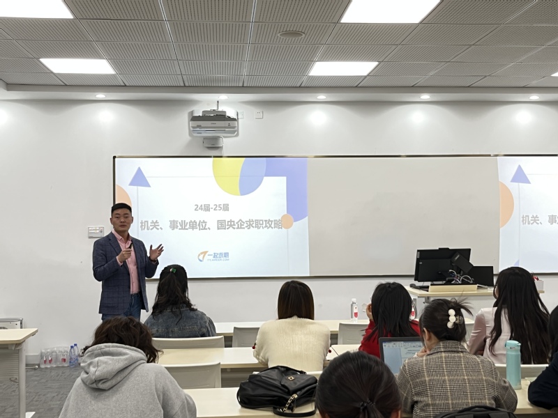第一场培训主题为“机关、事业单位、国央企求职攻略”。曹元东为同学们介绍了党政机关、事业单位、国央企的部门设置及对求职者专业和能力的要求,分析了各类型单位的薪资待遇和晋升空间等毕业生关注的重点问题。他还对党政机关、事业单位、国央企的招考信息做了全面解读,提醒同学们合理规划备考时间,做好充足的准备。他结合国央企网申简历的评分方式和排版技巧,强调对口实习经历在求职中的重要性,提醒同学们实习、求职是一件系统持久的事,一定要严肃、细致、认真地将自身条件与就业实际相结合,做到有的放矢,有备而来。