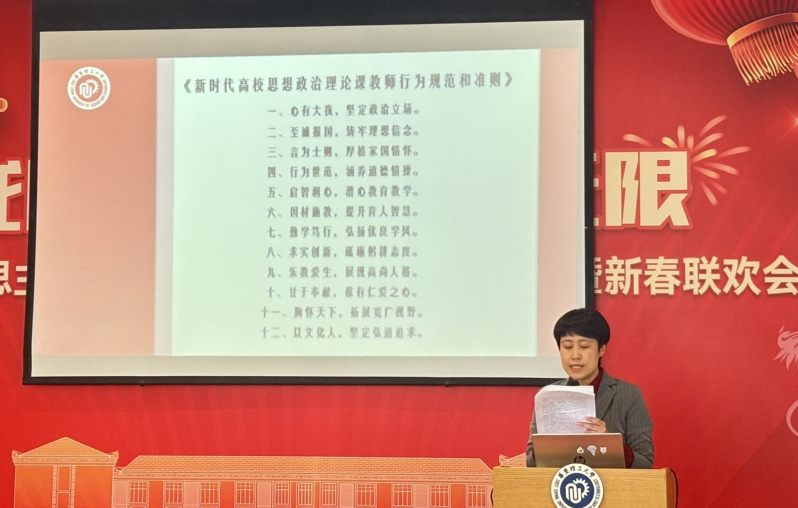 卢杨围绕《新时代高校思想政治理论课教师行为规范和准则》,从心有大我,坚定政治立场;至诚报国,铸牢理想信念;言为士则,厚植家国情怀;行为世范,涵养道德情操;启智润心,潜心教育教学;因材施教,提升育人智慧;勤学笃行,弘扬优良学风;求是创新,砥砺躬耕态度;乐教爱生,展现高尚人格;甘于奉献,葆有仁爱之心;胸怀天下,拓展宽广视野;以文化人,坚定弘道追求等十二方面对行为规范和准则进行了详细的解读。