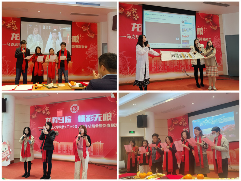 学院党委副书记杨倩演唱的《说唱脸谱》拉开了新春联欢会的帷幕,瞬间点燃了现场气氛。各教研室的老师们纷纷上台表演节目,展示才艺。思想道德与法治教研室的王瑞超给大家演唱了歌曲《如愿》,甜美温婉的歌声让老师们如痴如醉。毛泽东思想和中国特色社会主义理论体系概论教研室的王曦晨带来歌曲《不要犹豫》,让人感受到了积极向上的力量。习近平新时代中国特色社会主义思想概论教研室的老师们带领大家表演舞蹈《兔子舞》,整个会场宛如欢乐的海洋。由马克思主义基本原理教研室带来的情景短剧《断桥相遇》和歌曲《千年等一回》,让老师们又重温了许仙和白娘子的故事。中国近现代史纲要教研室的老师演唱了歌曲《童话镇》,带领老师们走进了童话的世界。习近平新时代中国特色社会主义思想概论教研室演唱的歌曲《相亲相爱一家人》,将联欢会带入了一个小高潮。学院党政工领导班子慷慨激昂朗诵诗歌《中华颂》,让全体老师再一次感受到了作为中华儿女的骄傲与自豪。学院行政办公室老师高歌《明天会更好》,唱出了马院人对未来的憧憬和希望。节目表演过程中还穿插了“你说我猜”、“抢凳子”等游戏,老师们全身心地投入其中,整个会场洋溢着欢声笑语。